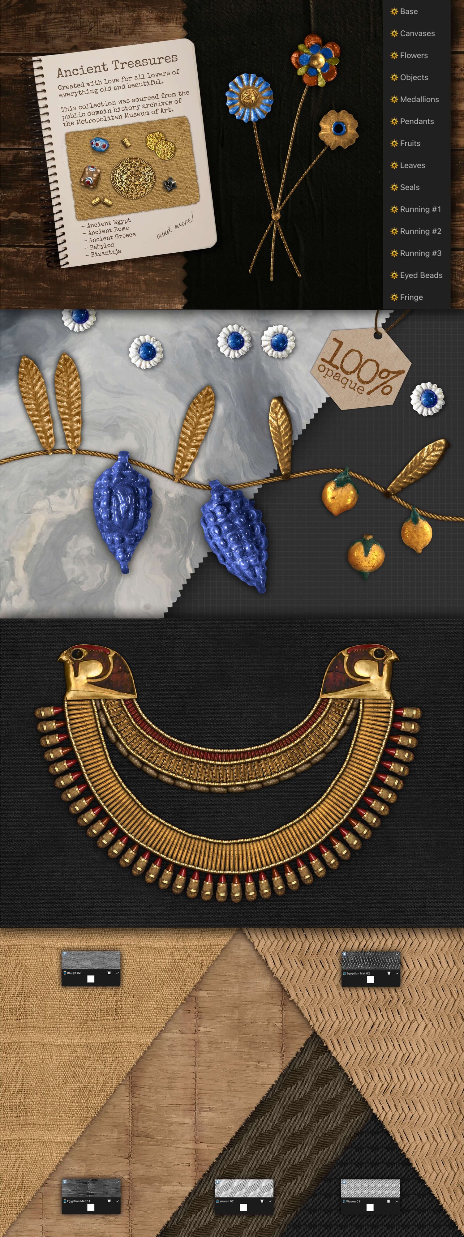 The shape images for the brushes were carefully sourced from the public domain history collections of the Metropolitan Museum of Art, and include beads as old as 2000 BC. Beads made of glass, gold, faience, stone, and bones from the New Kingdom Egypt, Ptolemaic Egypt, Persian Nishapur, Babylon, Byzantija, Roman Empire, Ancient Greece, and more. You can literally touch the history with these brushes.