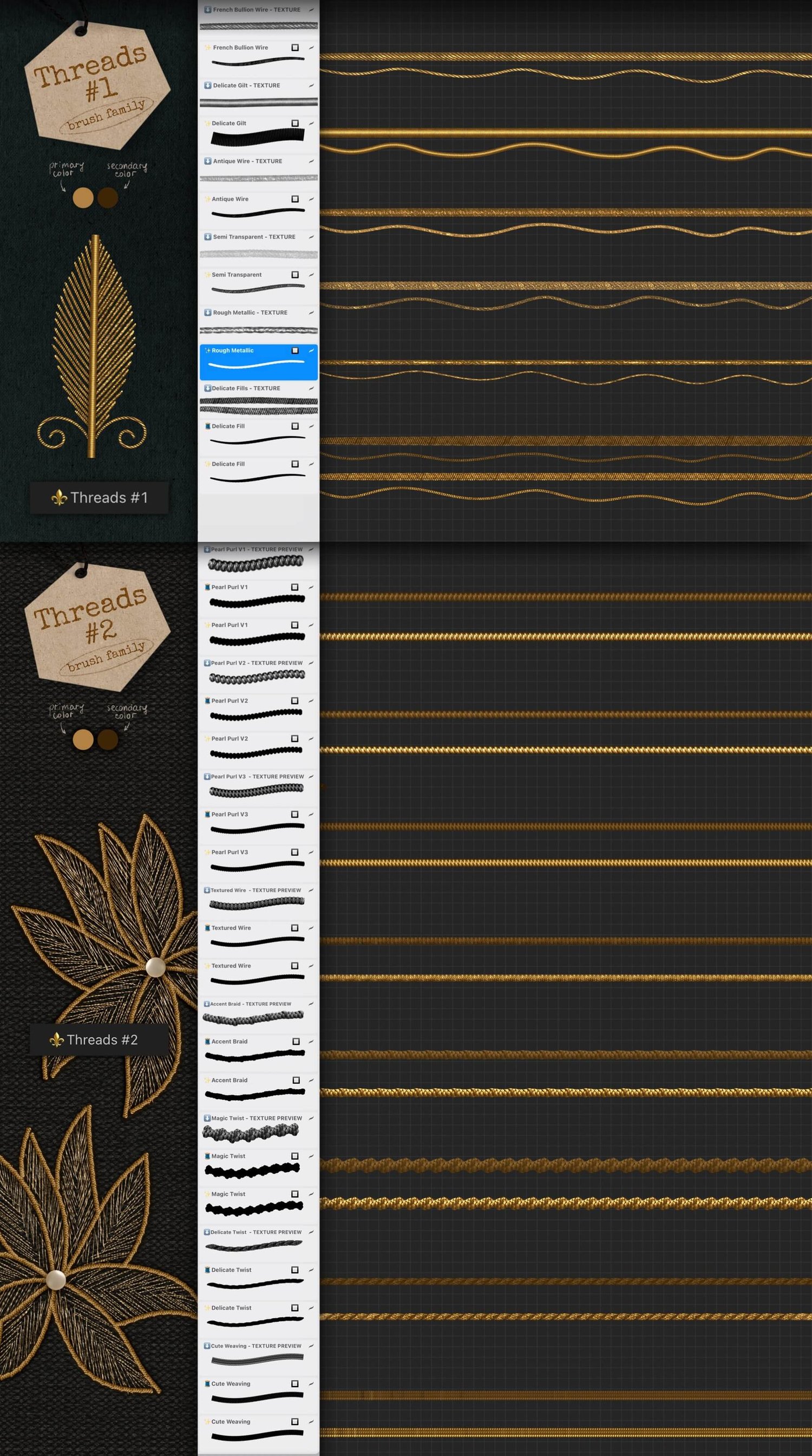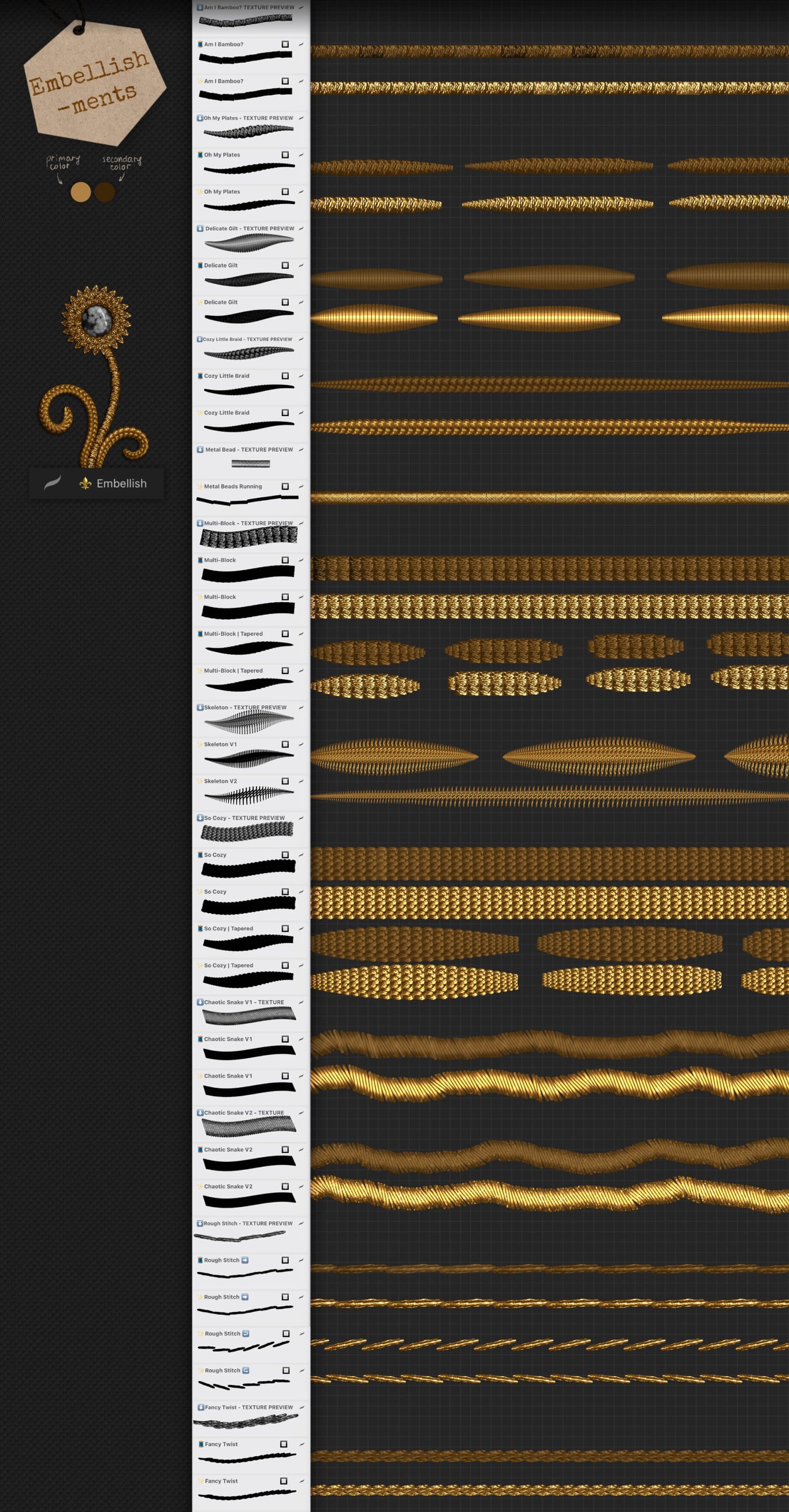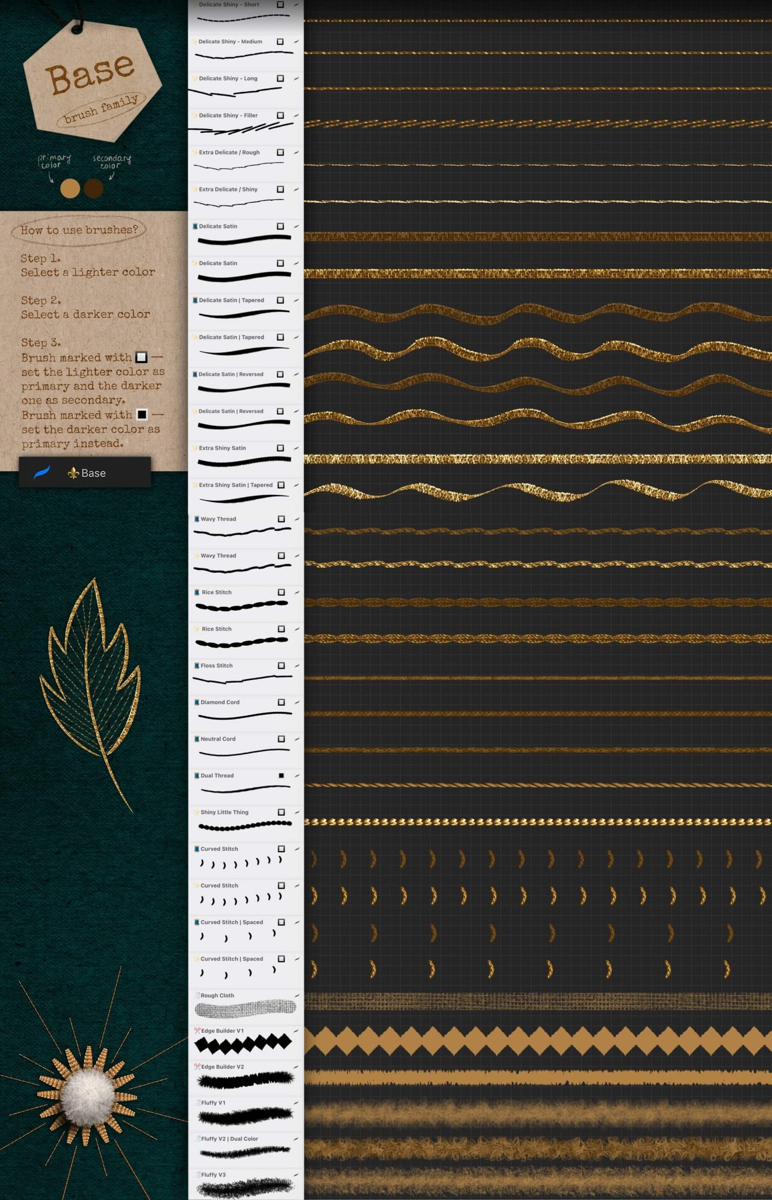 The stitching brushes are dual-color and are 100% opaque, meaning you don’t need to stress about tricky underpainting or fiddly adjustments. To draw, pick a pair of light and dark colors, set light color as active 🔲 (or dark if a brush is marked with 🔳), and you’re all set to create some goldwork magic!