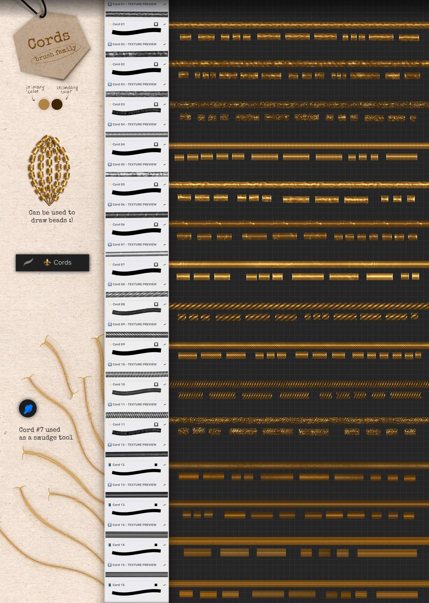 - 15 cords (can be used to draw long beads)